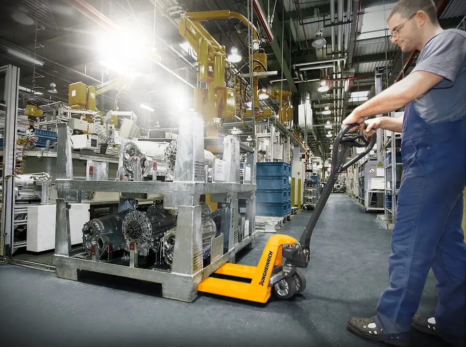 The robust and reliable AM 22 and AM 30 hand pallet trucks are ideal for the daily transport of goods over shorter distances. Both models are particularly easy to handle thanks to their ergonomic tiller heads, operable with either hand, and their optimised hydraulic systems with chromed wheel and joint bushings, allowing effortless movement of goods. Their durable construction, including high-performance or hardened steel, welded tiller mounting, and stable forks, ensures long-lasting performance. The compact, manoeuvrable design of the AM 30 provides a wide steering radius, quiet operation, and safe handling even with heavy cargo. Maintenance-free components and reinforced frames further enhance reliability, making these hand pallet trucks safe and efficient for warehouse and transport operations.