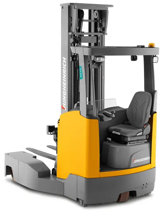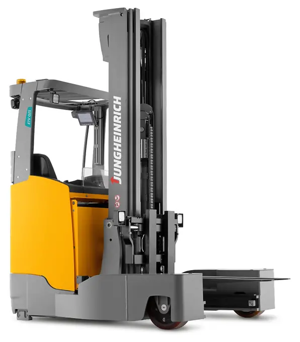 The versatile and manoeuvrable ETV Q multi-directional reach trucks are the perfect choice wherever oversized goods have to be transported in narrow aisles and lifted to great heights. The electric all-wheel steering allows for the particularly space-saving transport of loads up to eight metres long. 360° steering for minimum turning radius, extremely quick changes of travel direction and five available steering modes ensure highly efficient and safe handling of the truck. From modified normal travel and turning on the spot to sideways and parallel travel – everything is possible. And pre-programmed: Just a simple tap on the control panel and the truck moves in the desired mode. Easy and intuitive handling, excellent visibility, high energy efficiency and various assistance systems render our ETV Q the most versatile helpers in every warehouse.